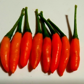Очень редкий сорт острого перца из коллекции Института Генетики (Германия). Высота растения до 60 см при выращивании в теплице. Активное боковое ветвление. Стручки в технической зрелости светло-зеленые, потом перецветают в оранжевые. В этом сорте много «диких» генов и одним из признаков является то, что стручки при созревании легко отделяются от чашечки и он склонен к осыпанию при созревании. Острота до 100 тыс сковиллов. Аромат дымный с землистыми нотами, очень необычный. При сушке аромат многократно усиливается. Срок вегетации 150–160 дней. При выращивании в домашних условиях потребуется горшок от 2-х литров. Идеален для сушки.