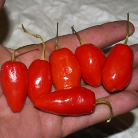Сорт острого перца из Бразилии. Растение компактное, высотой до 50 см Урожайность очень высокая. Стручки небольшие, в биологической зрелости белые, потом через оранжевый перецветают в красный. Отличные вкусовые качества. Аромат тропических фруктов с цветочными нотками. Острота до 200 тыс сковиллов. Срок вегетации 150–160 дней при выращивании в теплице. Для выращивания в домашних условиях потребуется горшок от 4-х литров. Для свежего употребления и для приготовления соусов.