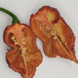 Очень острый сорт перца. Еще один миллионник. Я оцениваю остроту в пределах 1, 3–1, 5 миллиона сковиллов. На фотографии в разрезе видно очень развитую плаценту всю покрытую капсаициновым маслом. Сорт является кроссом Peach Ghost Jami с другим неизвестным сортом. Растение высотой до 120 см с активным боковым ветвлением. Урожайность очень высокая. Срок вегетации 150–160 дней при выращивании в теплице. Аромат мякоти фруктовый с дымными и землистыми нотами. Вкус очень сладкий с небольшой горчинкой в послевкусии. При выращивании в домашних условиях потребуется горшок от 5-ти литров. Для приготовления очень острых соусов.