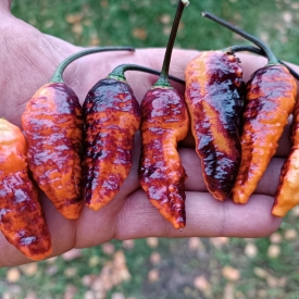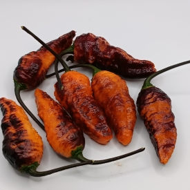 Растение высотой до 2-х метров почти без бокового ветвления. Скелет очень крепкий но требуется крепление к опоре ниже первого ветвления. Стручки в технической зрелости почти черные, потом красиво перецветают и становятся тыквенного цвета с антоциановым румянцем. В одном узле завязывается до 5 стручков. Ствол, листья и ветки черного цвета. Острота до 1 млн сковиллов. Вкус сладкий. Аромат фруктовый с цитрусовыми нотами. Срок вегетации 160–170 дней при выращивании в теплице.