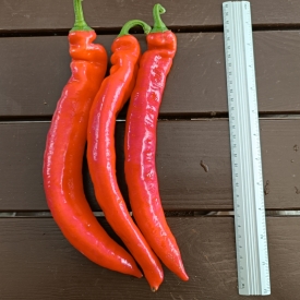 Растение высотой до 50 см. При недостатке освещенности склонен к вытягиванию вверх. Стручки очень большие до 30 см в длину. Стенка толщиной до 3 мм. Острота минимальная, до 500 сковиллов. Вкус и аромат, как у Рамиро.