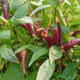 Сорт острого перца, который отлично подойдет для выращивания в домашних условиях. Высота растения до 35 см. Листва темно-зеленая с антоциановым налетом. Стручки растут пучками, направленными вверх. В технической зрелости стручки темно-фиолетовые, почти черные. Затем начинают красиво перецветать в алый через желтый и оранжевый с сохранением антоцианового налета.